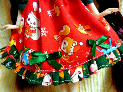 スカートには緑の飾りリボンを5つ。真ん中にビーズをあしらって、