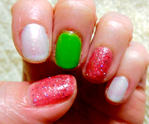 左手は、コニーをイメージした白とピンク