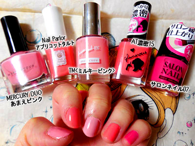 塗り比べも兼ねて手持ちのピンクをそれぞれ一本ずつ塗ってみた。