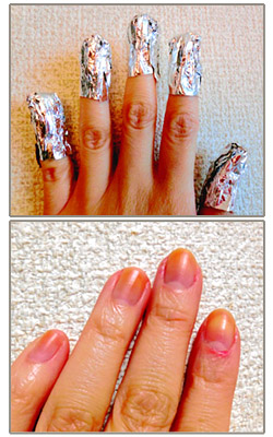 除光液たっぷりのコットンを爪に乗せ、アルミホイルで
