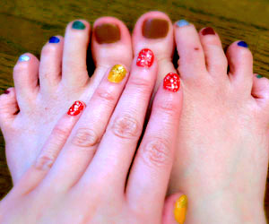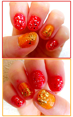 オレンジ(にゴールドラメ)と、ネイルカクテルの赤にしたら、