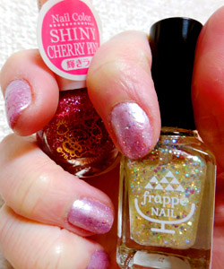右手はフラッペのみぞれを全体に、マイメロのピンクを爪先に